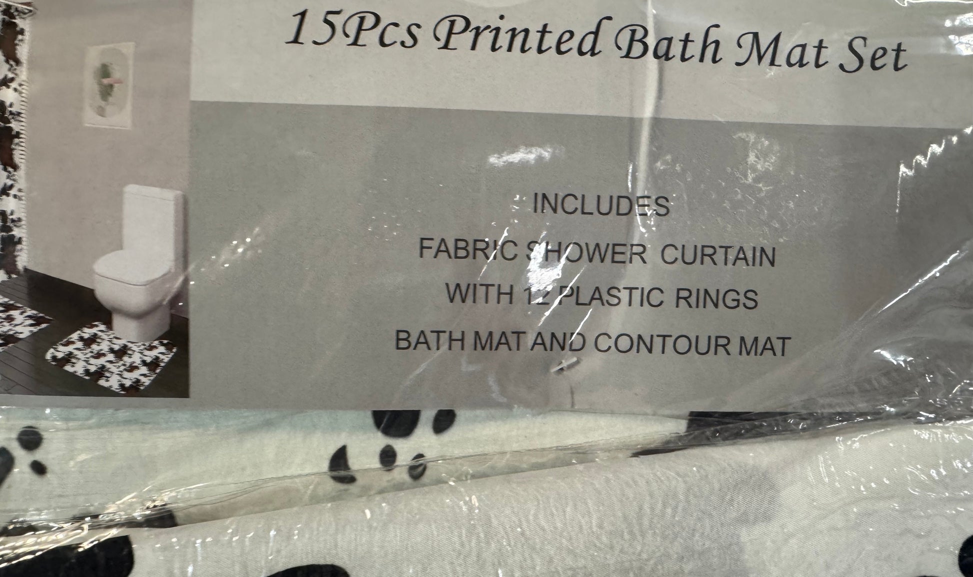 Equip your bathroom with this 15 piece cow print set. Enjoy the comfort of 2 memory foam nonslip mats, the durability of a mold resistant shower curtain, and the convenience of 12 shower rings. Keep your bathroom clean and stylish.