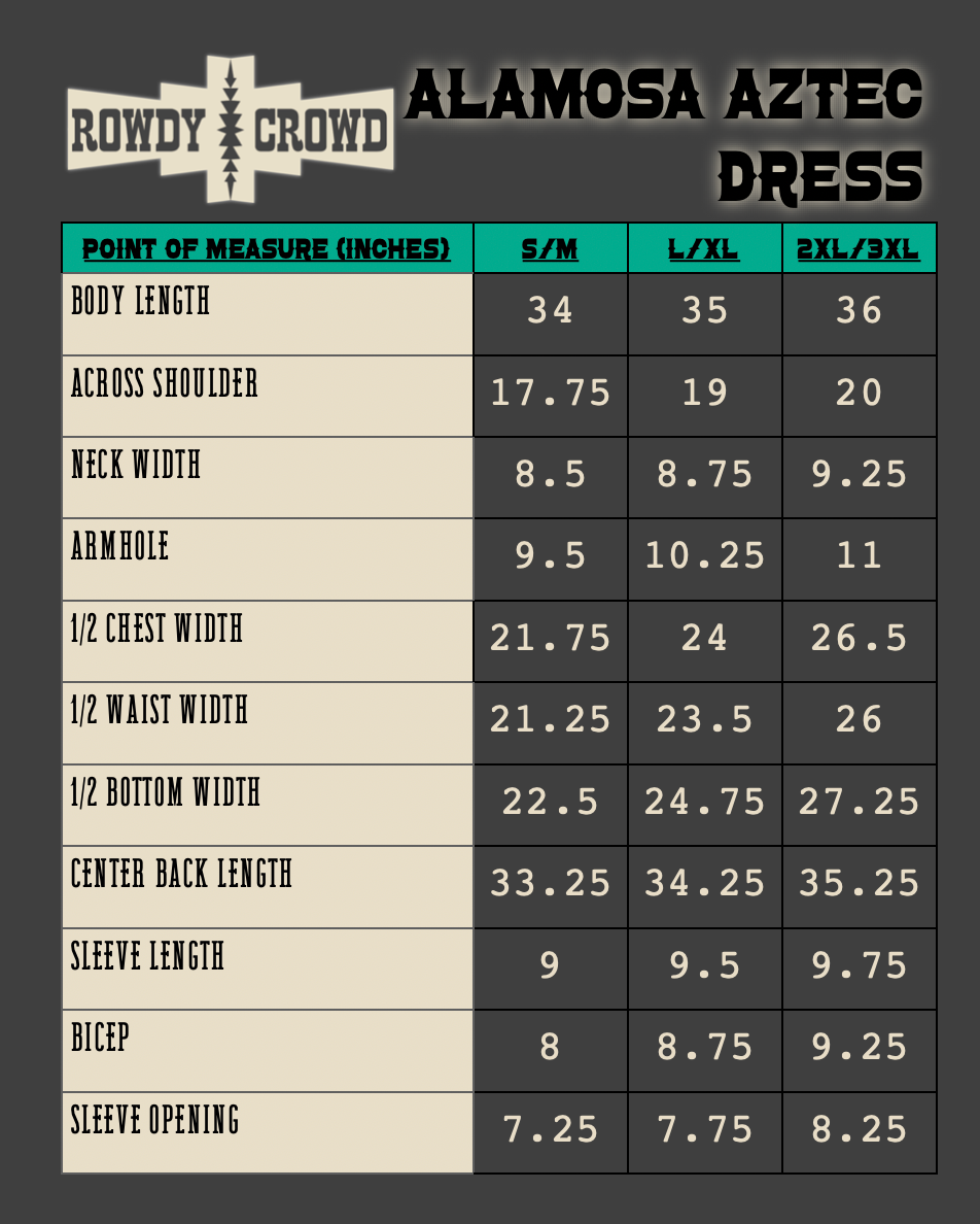 Introducing the Alamosa Aztec Dress! This taupe colored t-shirt style dress is simple, yet stylish. It features an aztec knit design in black, turquoise, red, and cream- Perfect for a night out or daytime shenanigans!