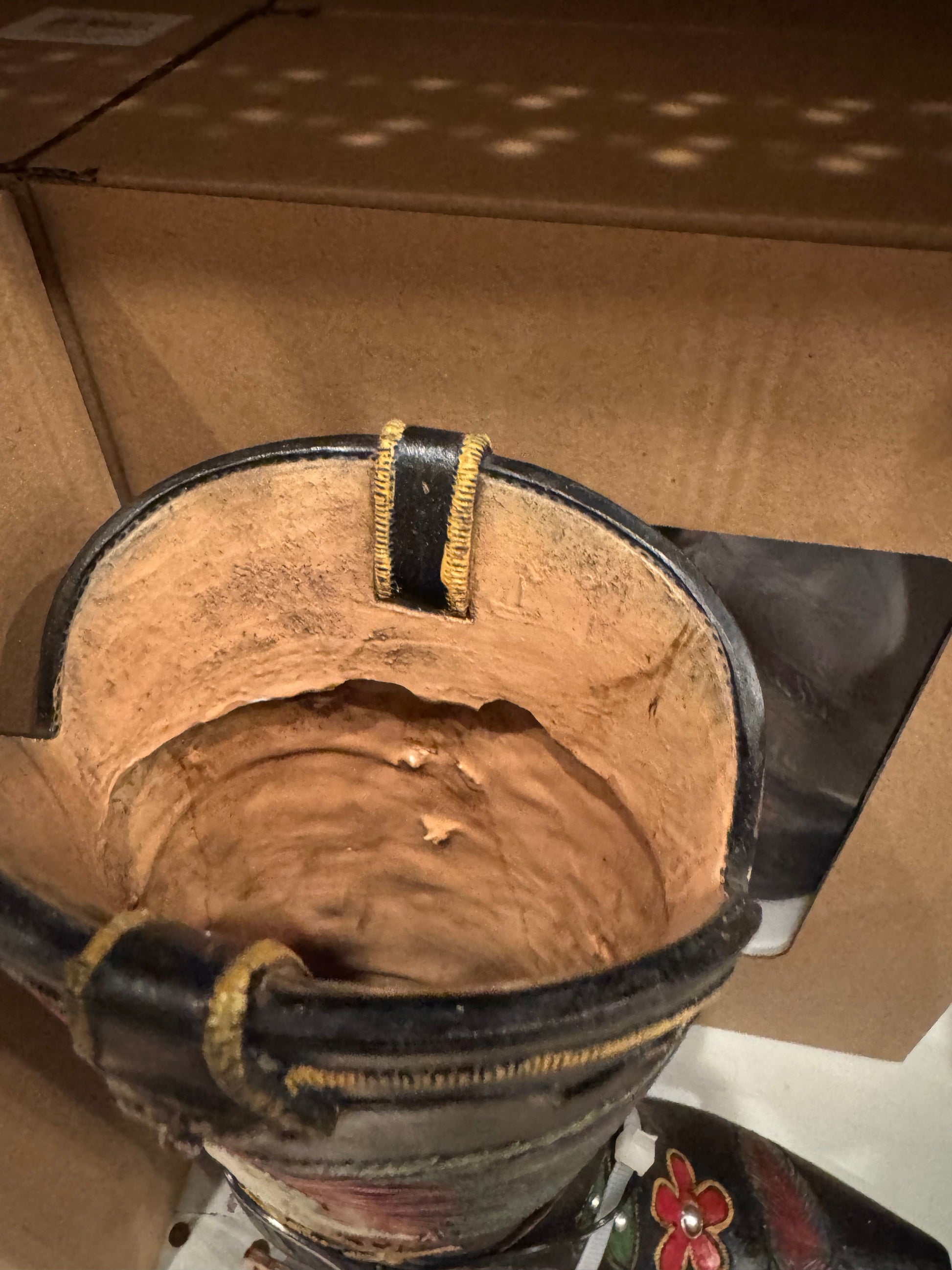 Enhance your home decor with our RA54123 Black Rooster Boot Vase. Made from high-quality resin, this boot vase boasts a sleek black finish and measures 10x8x3.5 inches. The perfect combination of practicality and style, it's sure to add a touch of rustic charm to any space.