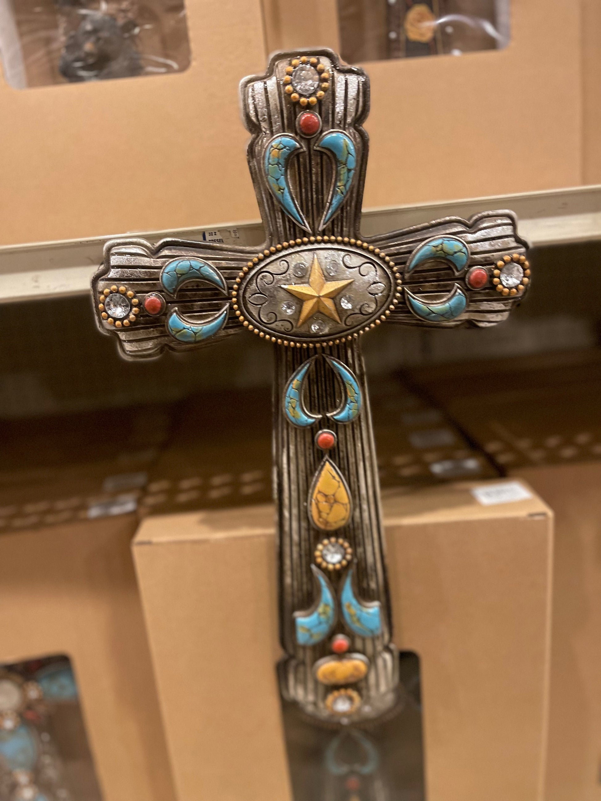 Experience the beauty of this Turquoise Stone Medallion Cross. This cross is crafted with stone and resin materials, resulting in a one-of-a-kind design. With a claw tooth hanger on the back, this 18.5”x11.25” cross is easy to hang. Add a touch of elegance and faith to your home decor with this stunning piece.