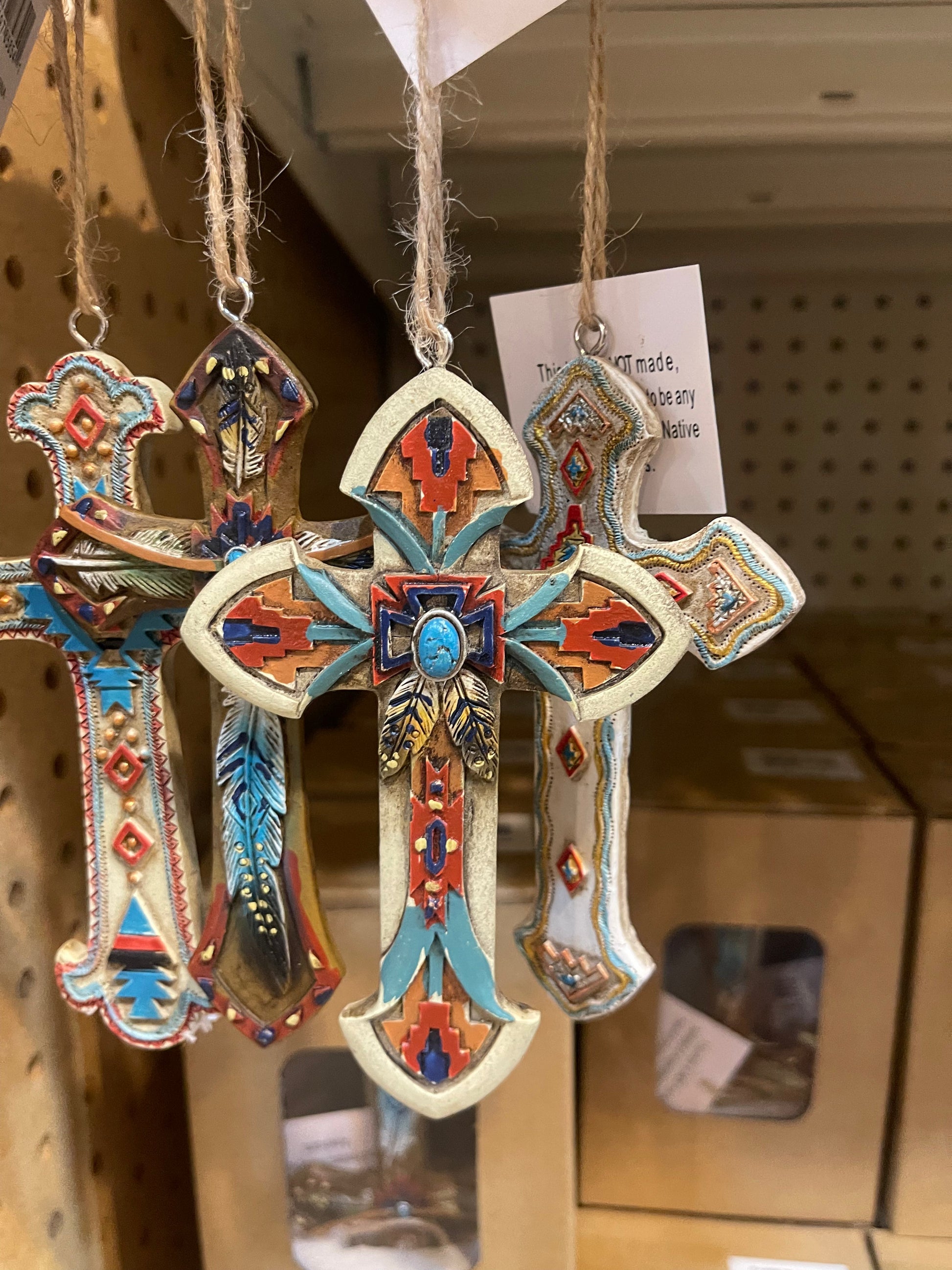 Expertly crafted, these Western Aztec Cross Ornaments are made from durable resin. This set of four ornaments, measuring 8x3 inches each, feature intricate designs influenced by traditional Aztec culture. Perfect for adding a touch of traditional charm to your holiday decorations.